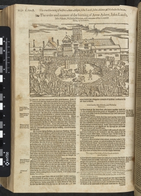 Page of text. Woodcut illustration: 'The order and maner of the burning of Anne Askew, John Lacels, John Adams, Nicholas Belenian, with certayne of the councell sitting in Smithfield'.