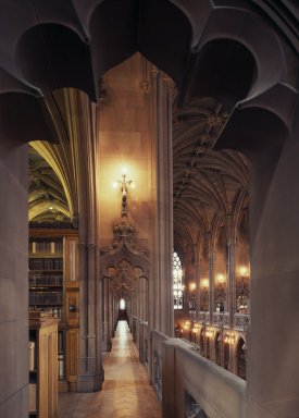 View through the arches of the South Gallery in the Reading Room of the John Rylands Library, Deansgate, as seen from the Arts Window end (East). Materials include shawk (sandstone) and oak.