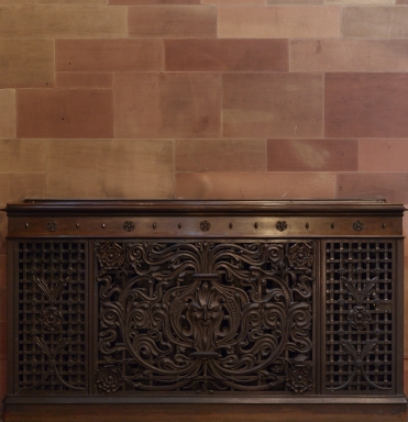 Bronze radiator case on the landing at the top of the Main Staircase.