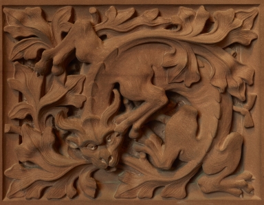 Stone carving of a dragon (mythological beast) in leaves; at entrance to exhibition room in the John Rylands Library.