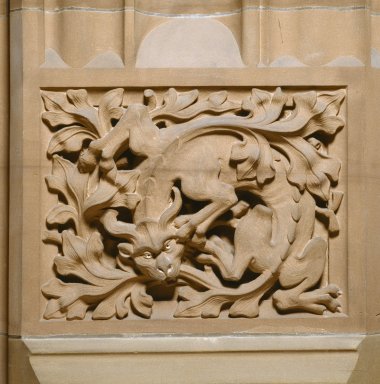 Stone carving of a dragon (mythological beast) in leaves; at entrance to exhibition room in the John Rylands Library, Deansgate, Manchester.
