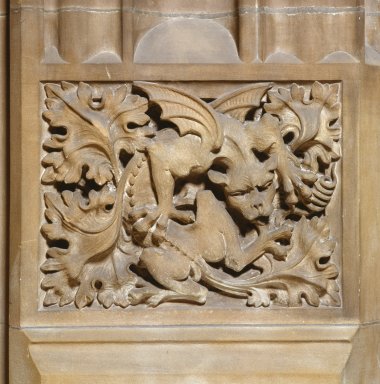 Stone carving of a dragon (mythological beast) in leaves; at entrance to exhibition room in the John Rylands Library, Deansgate, Manchester.
